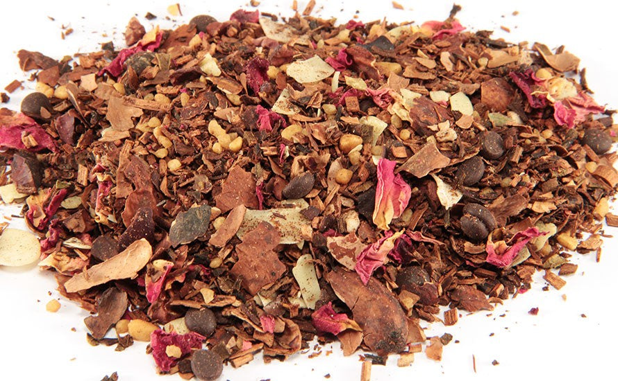 Mezcla de té Honeybush con cáscaras de cacao, nibs de cacao, chispas de chocolate y otros ingredientes.